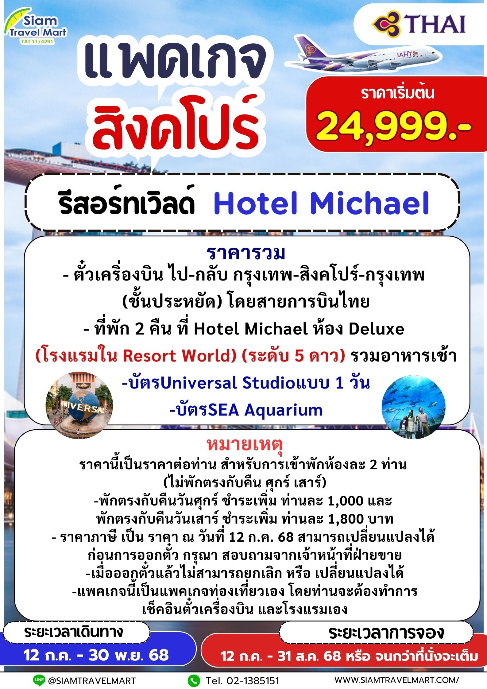 Call Center : 0-2742-9287 แล้วแจ้งรหัสทัวร์ PKG-SIN003